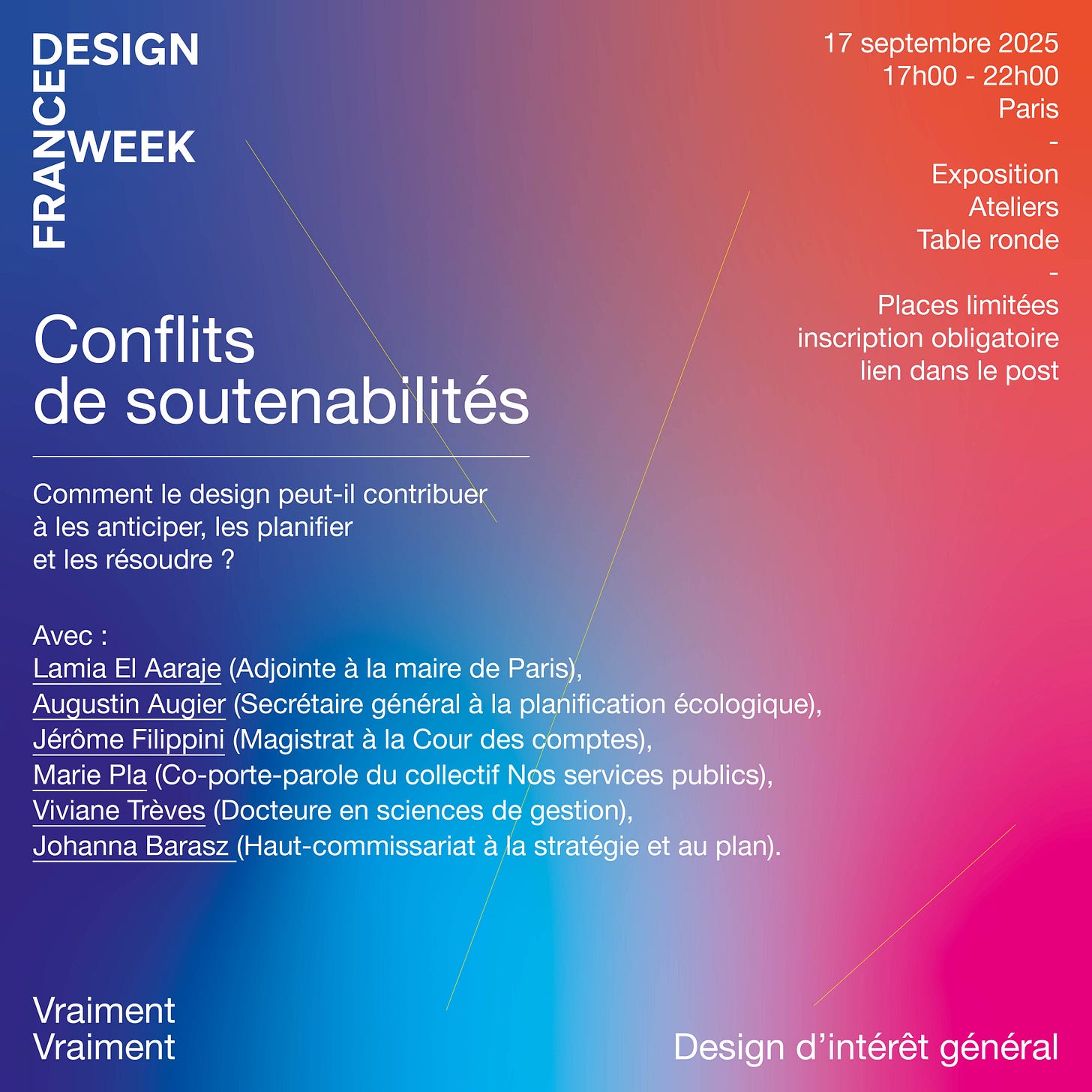 Des interventions de responsables publics (19h00-20h00) présentant leur expérience et leur vision des conflits de soutenabilité et interpellant les designers (et, au-delà, la communauté de l’innovation publique) avec notamment :